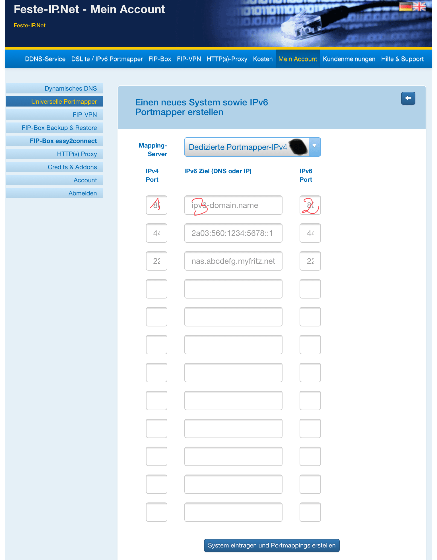 a. IPv4-Adresse mit dediziertem Portmapper von Feste-IP.net