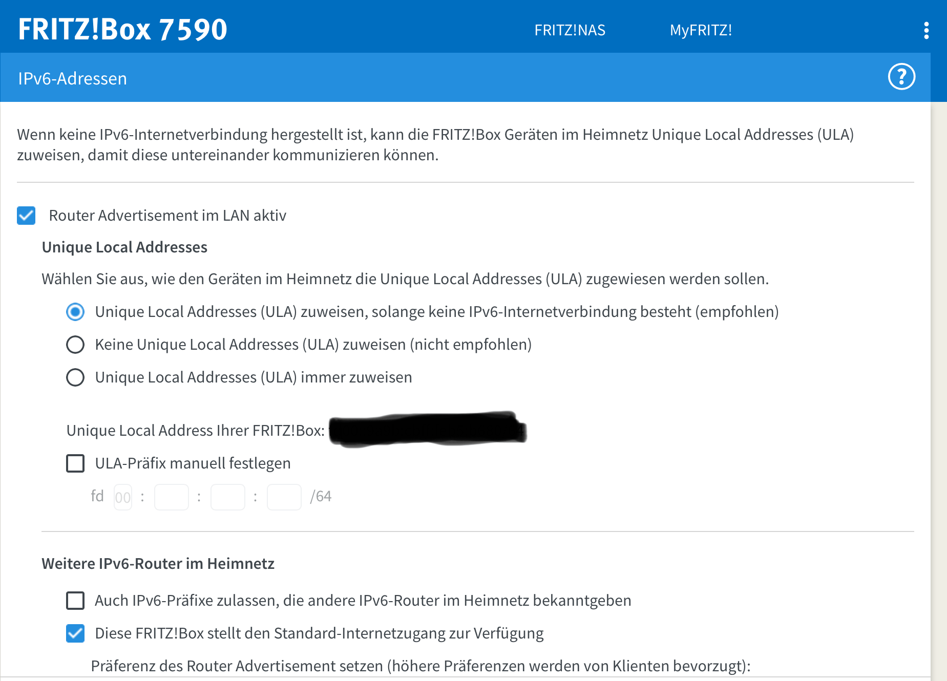 - Ganz wichtig: Zunächst ist sicherzustellen, dass die Synology-Diskstation eine IPv6-Adresse im Netzwerk zugewiesen bekommt. Hierzu sind die Einstellungen der FritzBox (unter Internet > Zugangsdaten > IPv6 entsprechend Bild 1a und unter Heimnetz > Netzwerk > Netzwerkeinstellungen > IP-Adressen > IPv6-Einstellungen entsprechend Bild 1b und 1c) und die Netzwerkeinstellungen der Diskstation in DSM (unter Netzwerkschnittstelle > LAN > Bearbeiten > IPv6 > IPv6-Setup: "Automatisch" oder "DHCPv6-PD", entsprechend Bild 1d) zu prüfen und ggf. anzupassen.