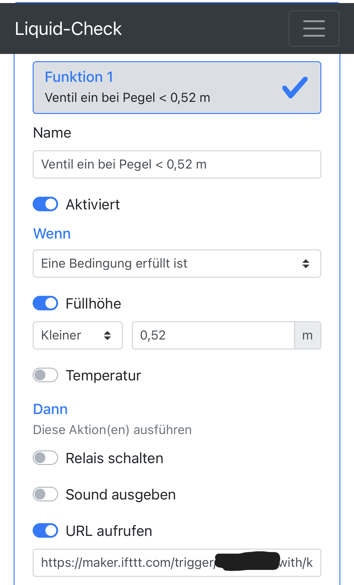 - Zum Schluss wechseln wir wieder in das Konfigurationsmenü des Liquid-Check. Unter "Erweiterung" > "Funktionen" können wir jetzt festlegen, wann die angelegten Szenen zum Öffnen und Schließen des Ventils ausgelöst werden sollen (siehe nachfolgende Bilder 10 und 11). In meinem hier gezeigten Beispiel "Ventil ein bei Pegel < 0,52 m" stellt man den Regler auf "Aktiviert", wenn "eine Bedingung erfüllt ist" und trägt die entsprechende Füllhöhe ein, zu der die Szene aktiviert werden soll, in meinem Beispiel, wenn der Füllstand kleiner als 0,52 m ist. Schließlich aktiviert man den Regler "URL aufrufen" und gibt dort die eben eingerichtete IFTTT-Webhooks-URL (mit https:// am Anfang) ein, die der Szene "Ventil öffnen" bei IFTTT/ELESION entspricht. Entsprechend geht man mit einer zweiten Funktion für das "Ventil schließen" vor, wobei man hier natürlich einen höheren Füllstand ("größer") einträgt. Die Werte muss man an seine eigenen Bedingungen anpassen und ausprobieren, bis alles passt.